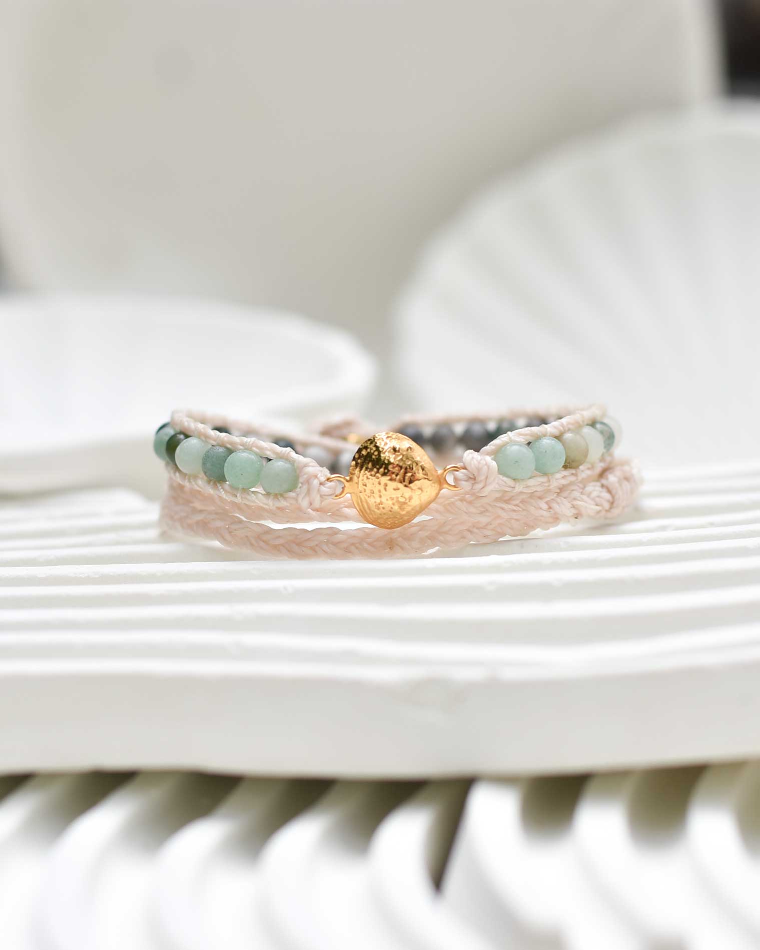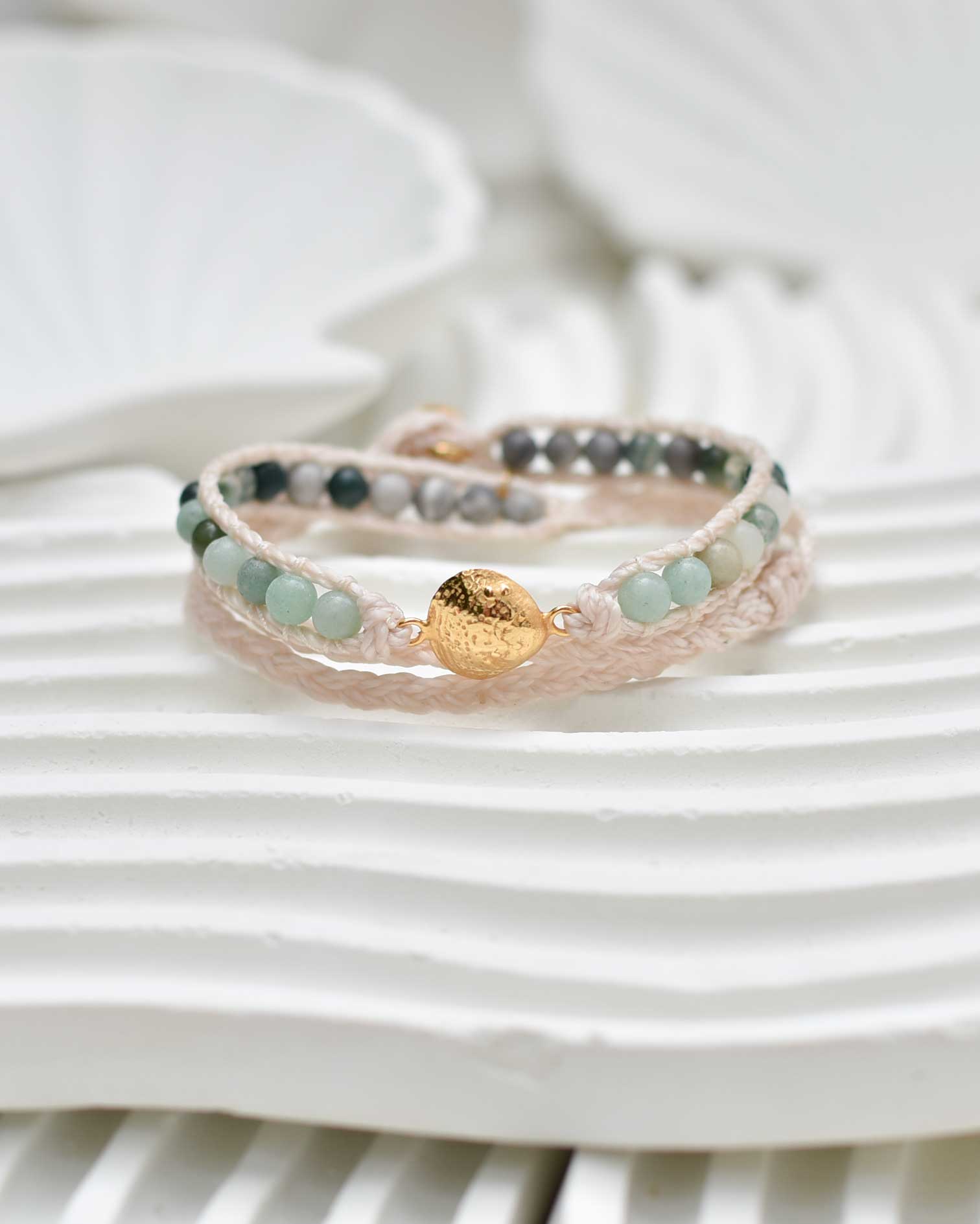 An elegant ocean-inspired wrap bracelet featuring soft green amazonite and moss agate beads, paired with a gold-plated silver shell charm. Its natural tones and delicate shimmer capture the calm beauty of coastal tides.